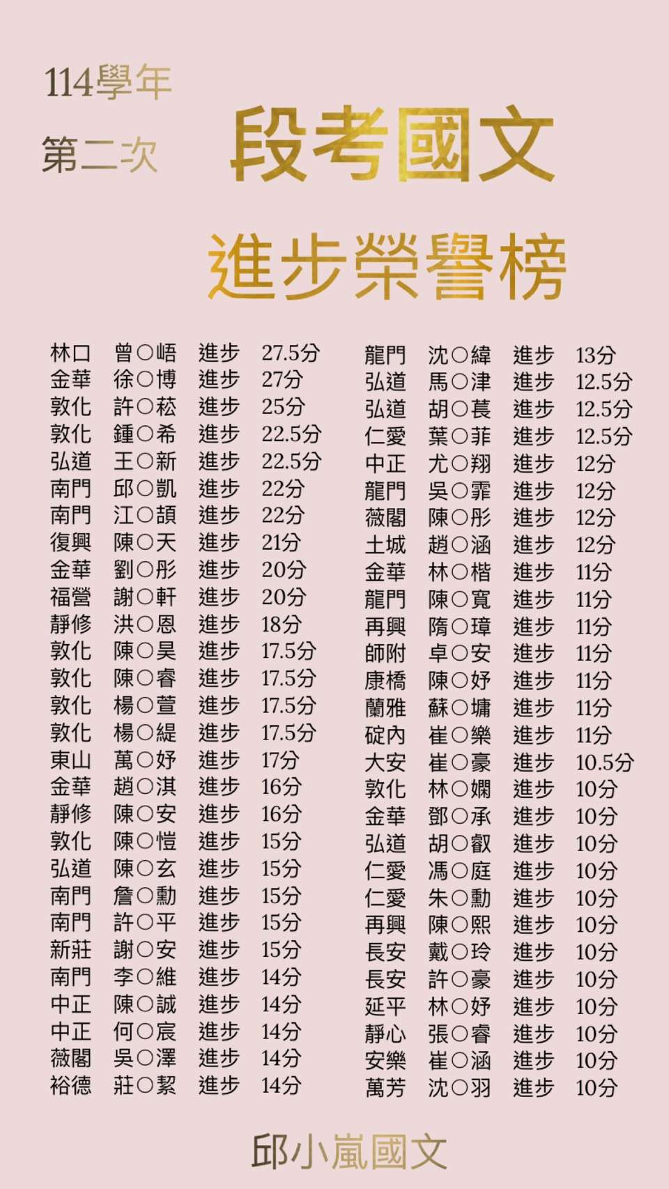 喝采!114學年第二次段考國文進步榮譽榜,數十位同學進步十分以上